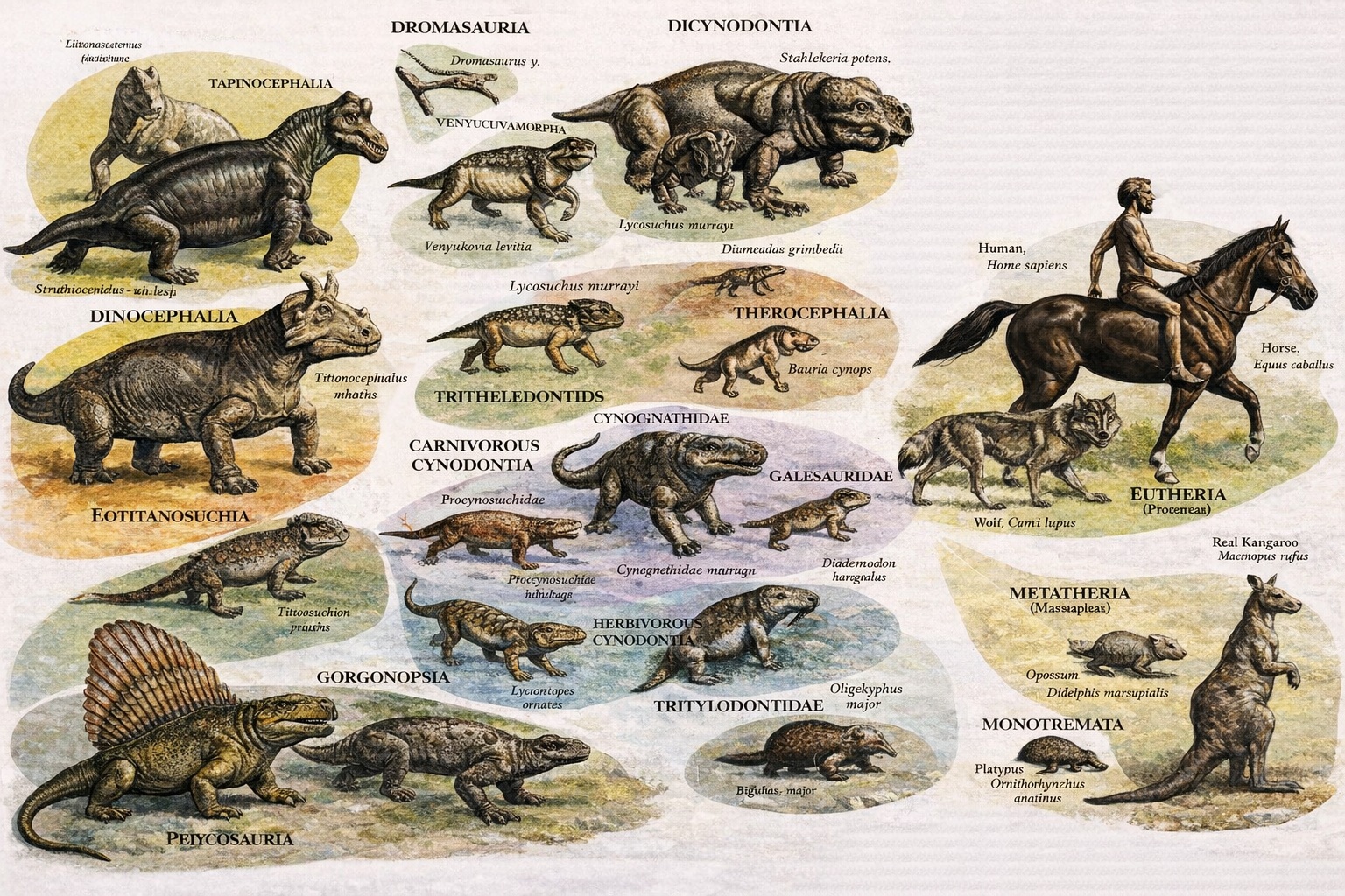 Αν θελήσουμε λοιπόν να κάνουμε μια χονδρική αντιστοίχηση με τις ισχύουσες σήμερα επιστημονικές υποδιαιρέσεις των περιόδων, θα δούμε ότι η πέμπτη δημιουργική ημέρα ξεκινάει περίπου στο τέλος της Δεβόνιας περιόδου, 419,62 έως 358,86 εκατομμύρια έτη,6 με αρχή της Λιθανθρακοφόρου, όπου τα πρώτα αμφίβια ξεκίνησαν να αποικίζουν τη ξηρά. Ήδη κατά την πρώιμη Λιθανθρακοφόρο περίοδο, 358,86 έως 298,9 εκατομμύρια έτη, είχαμε σχηματισμένα ερπετά, όπως τα εννοούμε σήμερα. Καλύπτει λοιπόν πλήρως τη Λιθανθρακοφόρο η πέμπτη δημιουργική ημέρα της Γένεσης. Όμως αυτή η πέμπτη δημιουργική ημέρα δεν τελειώνει με την εμφάνιση ερπετών που ζουν στη ξηρά. Επεκτείνεται ως την εποχή των θηλαστικών, δηλαδή καλύπτει επίσης την Πέρμια περίοδο, 298,9 έως 251,902 εκατομμύρια έτη, και η πέμπτη δημιουργική ημέρα τελειώνει στην Τριασική περίοδο, η οποία διήρκεσε 251,902 έως 200,4 εκατομμύρια έτη.7 Γιατί από τότε, όπως θα δούμε στη συνέχεια, έχουν βρεθεί ζώα που μοιάζουν με τα σημερινά ζώα, τα θηλαστικά. Εδώ τίθεται το εξής πρόβλημα. Η δημιουργία των πρώτων θηλαστικών συμπίπτει σε μεγάλο βαθμό με την εποχή των ερπετών που έζησαν κατά την πέμπτη δημιουργική ημέρα. Από πότε λοιπόν πρέπει να ξεκινήσουμε την αρχή της έκτης δημιουργικής ημέρας; Εδώ η Γένεση μας δίνει κάποιο σημάδι, γιατί δεν αναφέρει μόνο τα κήτη αλλά και τα ιπτάμενα ερπετά ως μέρος της πέμπτης δημιουργικής ημέρας. Όσον αφορά τα πτηνά που αναφέρει η Γένεση, (ή «πετεινά»), σημαίνει ζώα που πετάνε. Είναι λοιπόν σαφές στη Γένεση, στο χωρίο που εξετάζουμε, ότι από τα ύδατα εξελίχθηκαν ερπετά, κήτη και πτηνά. Το ότι αναφέρεται σε αυτά η Γένεση δείχνει ότι η πέμπτη δημιουργική ημέρα συνεχιζόταν και όταν εμφανίστηκαν τα ιπτάμενα αυτά ερπετά. Πότε λοιπόν συνέβη η εξέλιξη των πτηνών, σύμφωνα με τους επιστήμονες; Τα δύο είδη διαφορετικών ιπτάμενων ερπετών που έζησαν στις περιόδους αυτές, για τις οποίες μιλήσαμε στην πέμπτη δημιουργική ημέρα, είναι δύο εντελώς διακεκριμένες μεταξύ τους οικογένειες. Είναι οι Πτερόσαυροι, που έζησαν από τουλάχιστον 228 εκατομμύρια χρόνια έως 66 εκατομμύρια έτη πριν10 και εξαφανίστηκαν χωρίς να αφήσουν απογόνους, και μιλάμε και για τους ιπτάμενους δεινοσαύρους, που και αυτοί πετούσαν στην ίδια περίοδο με τους πτερόσαυρους. Μόνο που οι τελευταίοι αυτοί, αν και σήμερα δεν υπάρχουν, άφησαν απογόνους, τα σημερινά πουλιά. Τα πλάσματα αυτά ήταν όντα της πέμπτης δημιουργικής ημέρας, της εποχής που κυριαρχούσαν στη γη τα ερπετά. Προσέξτε. Η πέμπτη δημιουργική ημέρα μιλάει ΣΑΦΕΣΤΑΤΑ για υδρόβια ΕΡΠΕΤΑ, και όχι για ψάρια, όπως νόμισαν παλαιότερα κάποιοι χριστιανοί ή όπως θέλουν να ισχυρίζονται σήμερα ορισμένοι για να βρίσκουν υποτιθέμενες αντιφάσεις της Αγίας Γραφής με την επιστήμη. Τα ψάρια υπήρχαν βεβαίως πολύ νωρίτερα, αλλά η Γένεση δεν τα αναφέρει καθόλου. Δεν ασχολείται με αυτά. Το ότι η πέμπτη δημιουργική ημέρα καλύπτει όλη αυτή την τεράστια περίοδο, φαίνεται από την αναφορά της Γένεσης στα ερπετά κήτη και στα ερπετά πτηνά. Η πέμπτη δημιουργική ημέρα περιλαμβάνει και κήτη, όχι φάλαινες ούτε δελφίνια. Μιλάει για ερπετά εκεί, ερπετά που κολυμπούσαν στα ύδατα. Πρόκειται για πλάσματα που εξελίχθηκαν και πάλι σε υδρόβιους οργανισμούς από αυτά που είχαν ήδη βγει στη ξηρά. Και προφανώς περιλαμβάνει ακόμα και κάποια αρχαιότατα είδη κροκοδείλων, που εξελίχθηκαν σε υδρόβια.