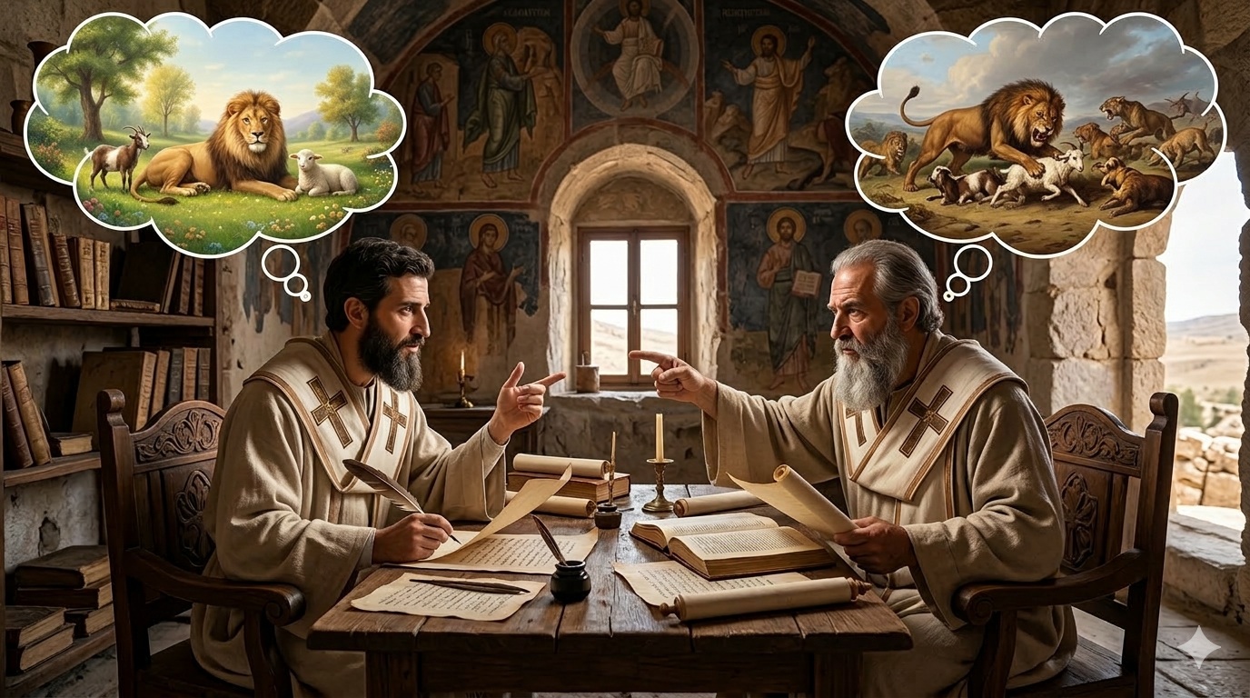 Κεντρική εικόνα: Ο άγιος Βασίλειος διαφωνεί με τον αδελφό του τον άγιο Γρηγόριο για την αρχική κατάσταση στην οποία δημιουργήθηκαν τα ζώα από τον Θεό. |