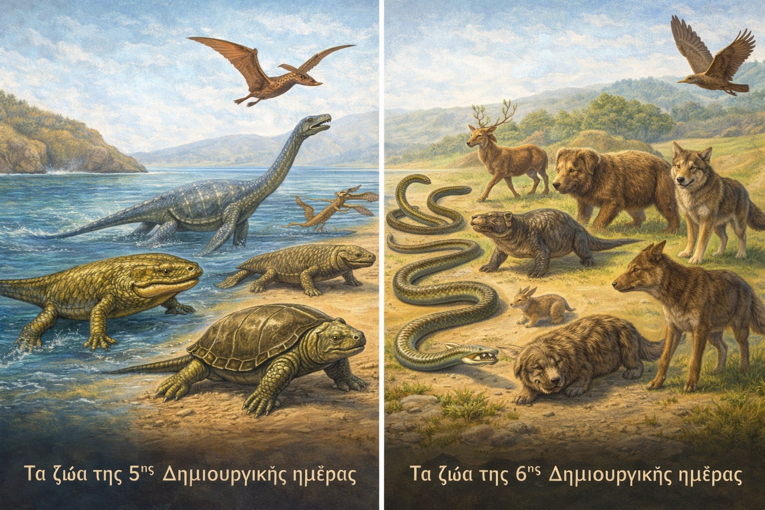 Χρονολογική τοποθέτηση τής 5ης και 6ης δημιουργικής ημέρας Σύμφωνα με τα παλαιοντολογικά ευρήματα, η πέμπτη δημιουργική ημέρα, συμπίπτει με τη Λιθανθρακοφόρο περίοδο, όπου πριν από 350.000.000 έτη βγήκαν στην ξηρά τα πρώτα αμφίβια, που ήταν πλήρως διαμορφωμένα τετράποδα "ερπετά". Συμπεριλαμβάνει επίσης την περίοδο ως και τη δημιουργία των πτηνών, στο Ιουράσιο του Μεσοζωϊκού, (τον καιρό των δεινοσαύρων), πριν από 150.000.000 περίπου χρόνια. Η έκτη δημιουργική ημέρα με τα θηλαστικά, συμπίπτει με την περίοδο του Κρητιδικού, πριν από 100.000.000 έτη περίπου, ως σήμερα. Πώς μπορούσε ο Μωυσής να γνωρίζει τη σωστή σειρά δημιουργίας πριν γίνει ο άνθρωπος; Ένα ακόμα στοιχείο για την ύπαρξη τού Δημιουργού. Ν. Μ. Επικαιροποίηση: 18-2-2026.